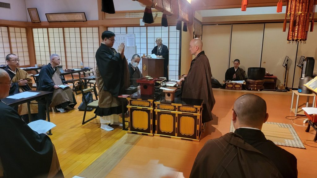 先日、不断光院様にて福岡教区一心寺からいらした永江憲昭上人を講師とし、「得度式」について学ばせて頂く機会を得ました。得度式とは、新たに仏法を学ばんとして出家する者を迎える儀式であり、新たに出家する者、新発意(しんぼっち)にとっては、仏の教えに従い、仏弟子となり歩む決意を固める日でもあります。そしてその講習会の実践法式では、私が比較的若年だったこともあり、新発意を務めさせていただきました。