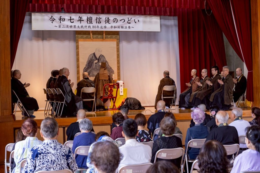 場所を島袋自治会館に移し、改めて終戦八十年追悼・平和誓願法要、ならびに三州教区 檀信徒のつどいが開かれました。体育館ほどの広さの会場も、楽邦寺と同じくほとんどの席が埋まるほどたくさんお集まりいただき、参加者の皆さんは勝部上人のご法話に一心に耳を傾けられ、時には深く頷かれておりました。